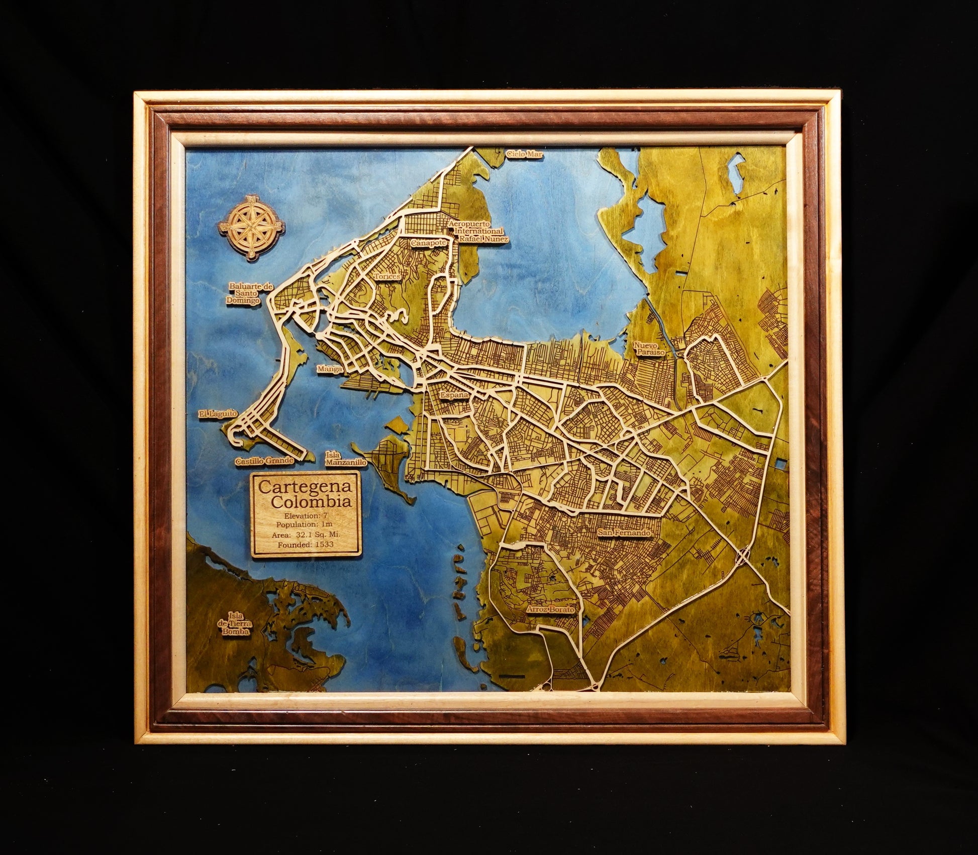 A 27.5w x 25.5h inch laser cut map, hand dyed, Maple and Walnut Frame, Double Strength glass